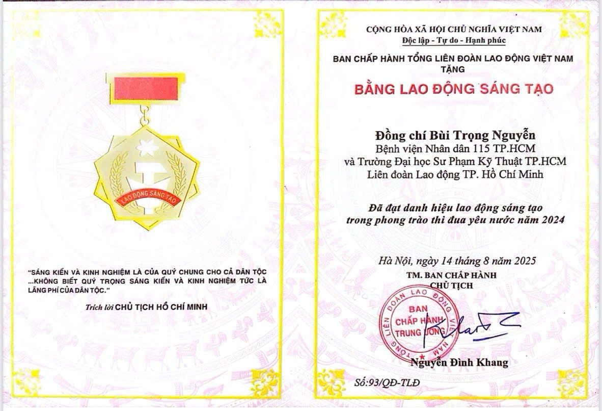 Đặc biệt, sáng kiến này của ThS. Bùi Trọng Nguyễn – Phó Trưởng phòng Chỉ đạo tuyến, Bệnh viện Nhân dân 115 cũng đã vinh dự được chọn là một trong 20 sáng kiến tiêu biểu toàn quốc, được Tổng Liên đoàn Lao động Việt Nam trao Bằng Lao động sáng tạo năm 2024. Đây là sự ghi nhận xứng đáng cho những nỗ lực nghiên cứu, ứng dụng công nghệ mới của đội ngũ cán bộ y tế bệnh viện, đồng thời khẳng định dấu ấn tiên phong của Bệnh viện Nhân dân 115 trong công cuộc đổi mới sáng tạo ngành y.