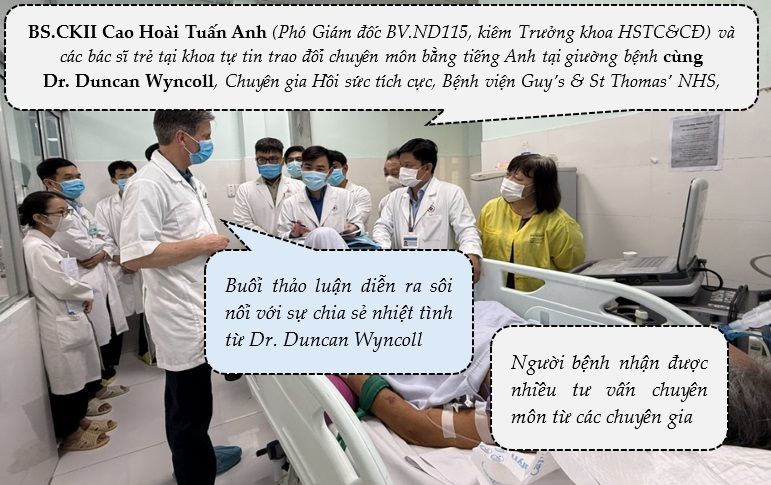 Tại buổi làm việc, các chuyên gia quốc tế cùng đội ngũ bác sĩ BVND 115 đã thảo luận về những trường hợp bệnh nặng, tìm kiếm phương án điều trị tối ưu. Đặc biệt, các dược sĩ lâm sàng của bệnh viện cũng tích cực tham gia trao đổi với dược sĩ Catherine từ Anh Quốc và các dược sĩ Bệnh viện Bệnh Nhiệt đới, góp phần nâng cao hiệu quả sử dụng thuốc trong điều trị.
