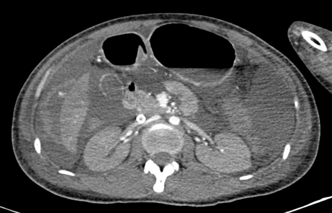 Hình 1. Dịch ổ bụng lượng nhiều, nghi ngờ chảy máu ổ bụng trên phim chụp cắt lớp vi tính