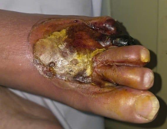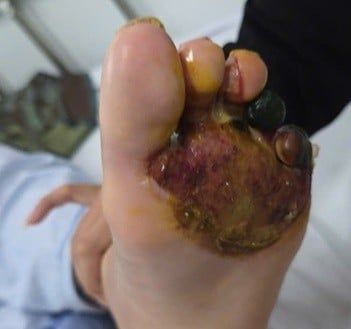 Hình 2. Tổn thương mu chân lan rộng, nguy cơ nhiễm trùng và cắt cụt cao.
