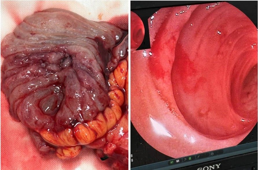 Hình. Ổ loét ruột non (bên trái) và điểm xuất huyết (bên phải).