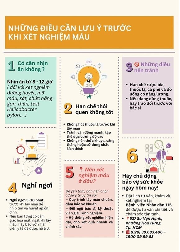 Nếu bạn chưa rõ cần nhịn ăn bao lâu hoặc có phải ngưng thuốc trước khi lấy máu hay không, Bệnh viện Nhân dân 115 luôn sẵn sàng tư vấn và hỗ trợ để quá trình xét nghiệm của bạn diễn ra thuận lợi, an toàn và chính xác nhất.