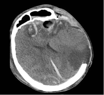 Hình 1. Phim CT não người bệnh G.A. ngày 06/01/2026 cho thấy dập não xuất huyết nhiều nơi, phù não lan tòa dù đã được mở sọ giải ép tối đa.