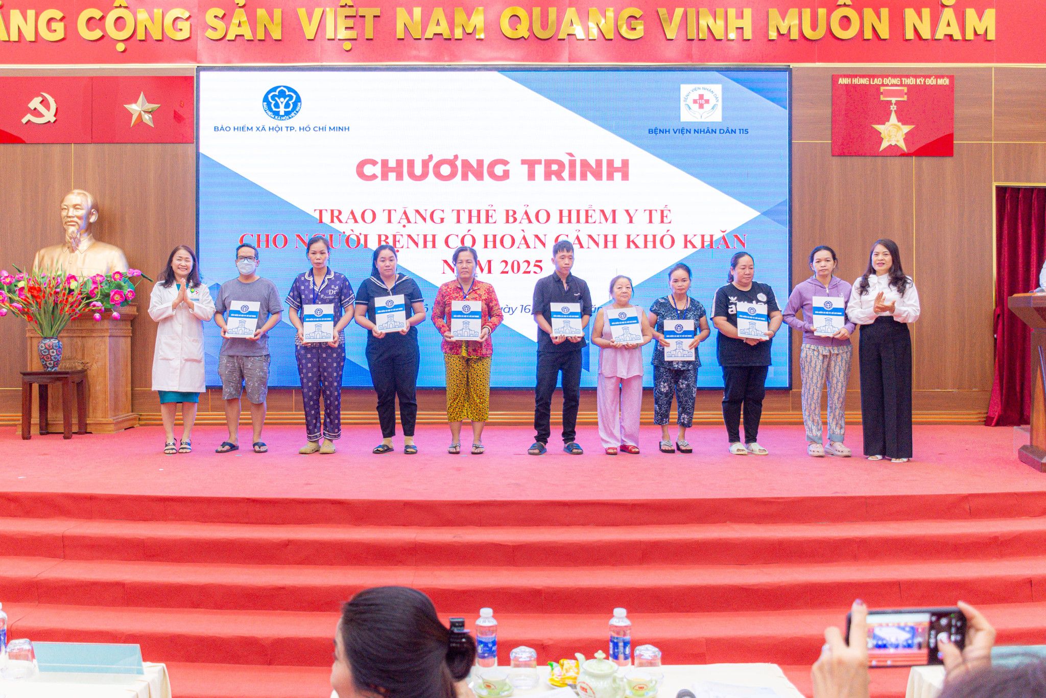 Nhân dịp này, Bảo hiểm xã hội TP.HCM và Ban Giám đốc Bệnh viện Nhân dân 115 đã cùng trao tặng 20 thẻ bảo hiểm y tế và 10 phần quà đến những người bệnh có hoàn cảnh khó khăn và người dân ở phường Hòa Hưng. Đây là hoạt động mang đậm tính nhân văn, thể hiện tinh thần sẻ chia, đồng hành với người dân yếu thế trong việc tiếp cận dịch vụ y tế và giảm bớt gánh nặng chi phí điều trị.