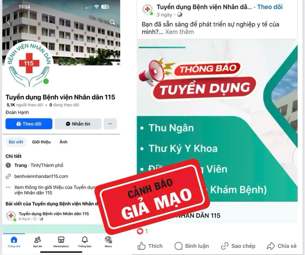 Qua rà soát thông tin trên mạng xã hội Facebook, Bệnh viện Nhân dân 115 phát hiện đối tượng giả mạo danh nghĩa Bệnh viện Nhân dân 115 đăng tải thông tin tuyển dụng, gây ảnh hưởng đến uy tín Bệnh viện và quyền lợi của người lao động.